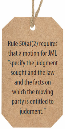 Rule 50(a)(2) requires that a motion for JML "specify the judgment sought and the law and the facts on which the moving party is entitled to judgment." The Alabama Supreme Court has stated that "appellate review is preserved by a Rule 50(a) motion 'alleg[ing] a lack of evidence' as to each of the plaintiff's claims."16 The court has also stated that the motion should identify "the count which is not supported by evidence and detail[] with specificity the grounds upon which the particular count is not supported by the evidence."17