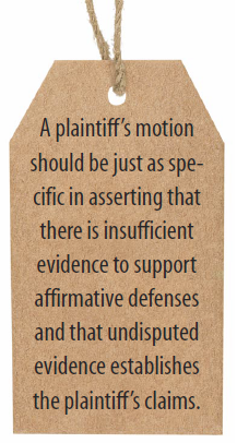 It is therefore paramount that a party's motion for JML at the close of all the evidence be specific and include all possible grounds of evidentiary insufficiency. To be thorough, defendants' motions should assert that there is insufficient evidence to support each count, each claim, each element of each claim, each material factual allegation, and each item of damages as to which the defendant contends the plaintiff lacks substantial evidence.25 Defendants' motions should also aver that the evidence establishes each affirmative defense that the defendant contends is supported by substantial, undisputed evidence.26 If there is more than one plaintiff, each with his or her own claims, the defendant's motion should assert all grounds as to each plaintiff separately and severally.27 The motion should also cite supporting legal authority.28 A plaintiff's motion should be just as specific in asserting that there is insufficient evidence to support affirmative defenses and that undisputed evidence establishes the plaintiff's claims.